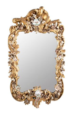 Rare Rococo German Giltwood Carved Mirror with Porcelain Medallions Insets