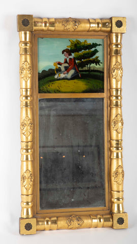 A small gilt mirror with an eglomise panel of a bucolic scene with a young boy. Mid 19th century.