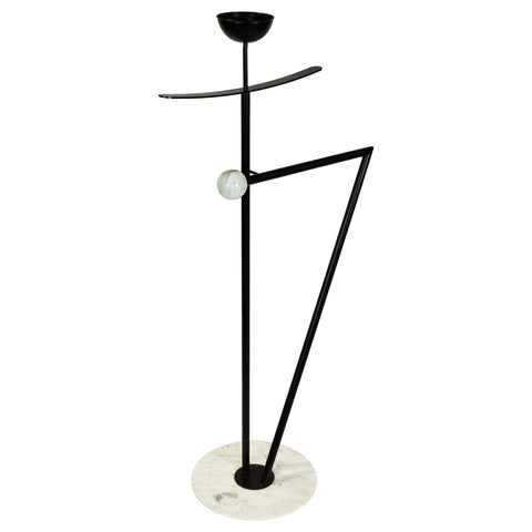 Dramatic and geometric valet with polished marble base and arm cap ball, the body in black enameled metal. Circa 1980's.