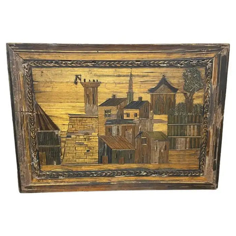 A beautiful 'as is' late 18th or early 19th century example of 'Marqueterie de Paille', or straw marquetry, work box. The top inlaid with a wonderful cityscape, with early architecture and what appears to be a tower under construction. The interior retaining the vibrant original coloring, showing an interesting building with three spires flanked by two panels of crossed flutes? These all lift up to reveal small drawers the central panel has a cool checkerboard floor. There are two needle cushions. Every surface decorated with exquisite and colorful inlay. Rough condition, but still retaining lots of charm. Priced accordingly. Old Christie's tag on the bottom, great provenance. Provenance: The Collections of Principessa Ismene Chigi Della Rovere. Circa 1790 - 1810.