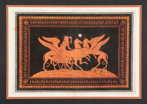 18th century hand-colored engraving, with and unusual dynamic scene of a goddess riding a chariot pulled by two horses fighting off an attack by two griffins. With a heart-form in white above. From Lord Hamilton's folio, "Antiquités Etrusques, Grecques et Romaines", (1766-1776). This is a really nice etching, large size with vibrant color and in very good condition. Beautifully matted and framed in gilt wood.