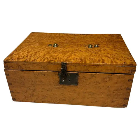 19th century birdseye maple box with brass nail head decoration and iron lock plate and hasp. This box is hand crafted with beautiful dovetail joints visible on the corners, evidence of true craftsmanship. A wonderful glowing patina that only comes from age and use. With simple decorative brass nail heads on the top adding to the charm. Black iron lock plate and hasp, no key. Circa 1850.