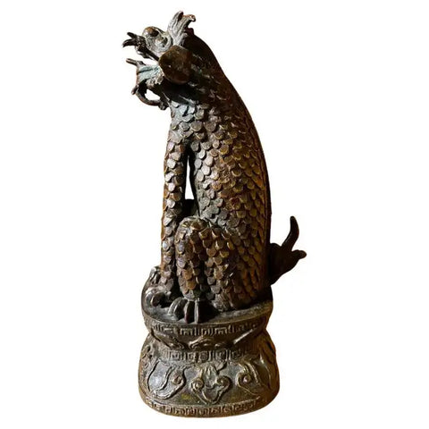 19th century, or possibly earlier, seated bronze chimera, cast as a ferocious scaled beast seated in a defensive crouch with its head facing forward as it opens its mouth in a roar exposing the tongue, and the ears shown among backswept horns. The chimera seated on an integral base. A wonderful small sculpture that exudes a lot of presence.