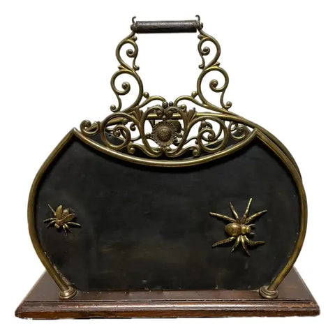 Fun and whimsical Victorian magazine rack black patinated sheet steel famed in brass with brass spider and flies attached. All mounted on a stepped mahogany base. A wooden handle held by brass arabesques with sunflower motifs. An extraordinary piece of pure joy, with a practical use. Circa 1880.