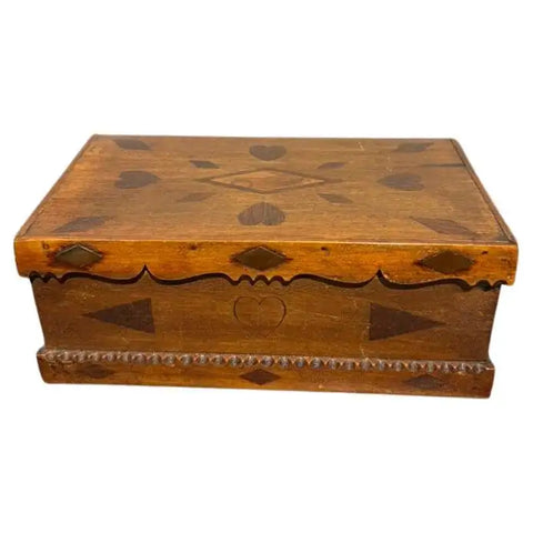 19th century American folk art box with decorated with inlaid hearts, diamonds, triangles and shields. Possibly sailor made, this sweet little box was likely a valentine or keepsake gift to a beloved. It will certainly make a great and unique Valentines Day gift - or sweet gift to your own beloved - or your beloved self! Circa 1880.
