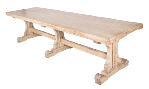 19th century Italian Baroque style large scale cerused oak refectory table, circa 1890. The almost 10 foot long top joined by three pedestal supports connected by a single long stretcher locked in place by wedges. The pegged construction and style is typical of 17th century tables from Tuscany. A beautiful table ready to be utilized as a center of your family feasts and celebrations.