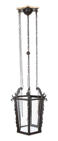 A German iron lantern circa 1920-30 attributed to Bruno Paul. Now with light cluster installed.