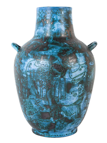 A Jacques Blin ( France., 1920 - 1995 ) sgraffito glazed stoneware baluster form vase with 2 handles and animal decor. Incised signature. Circa 1955.