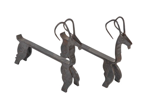 A pair of amusing English wrought iron andirons. Antelopes ? Circa 1925.