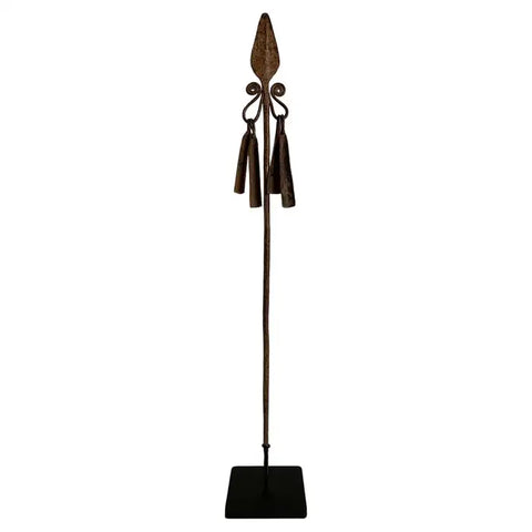 Wonderful spear form currency with spiral loops below the spear head festooned with three 'bells' on each side. An appealing design executed by a master craftsman. Beautifully mounted on a custom steel base. Democratic Republic of the Congo. 20th century.