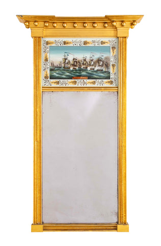 American giltwood framed mirror with unusual original eglomise panel painting titled "Perry's Victory", depicting Commodore Oliver Hazard Perry's important War of 1812 victory at the Battle of Lake Erie, September 10, 1813. In one of the largest naval battles of the War of 1812, Perry led 9 US Navy vessels to victory over 6 British Royal Navy vessels, which allowed the US to control the lake for the remainder of the war and to recover Detroit. In a famous dispatch to Major General William Henry Harrison after the Battle of Lake Erie, Perry wrote : "We have met the enemy and they are ours. Two ships, two brigs, one schooner and one sloop."