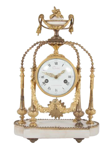 An 18th Century French gilt bronze Portico clock with six columns culminating in floral urn with white enamel face; all on white marble base over a gilt wood base.