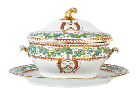 An English covered tureen on stand having an armorial crest.  Circa 1800.