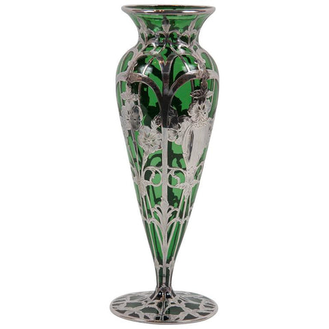 Art Nouveau Alvin Sterling over Green Glass Vase