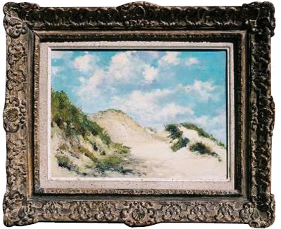 Belgian School Landscape "Path in the Dunes" circa 1920. An oil painting on canvas from the Belgian school. A gallery tag from Brussels is on the back of the frame. The painting is in its original Louis XV style frame.