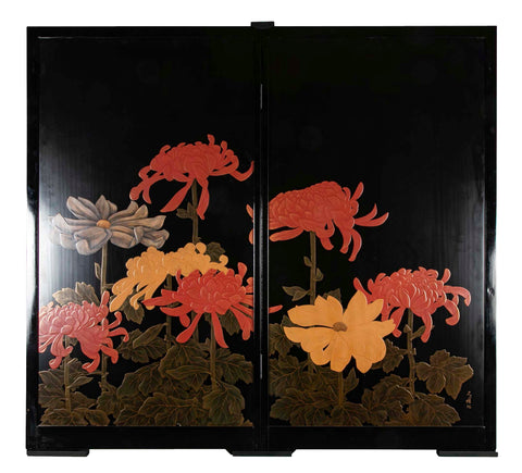 Black Lacquer Screen with Bold Red, Yellow & White Chrysanthemums Signed Kunio Saku