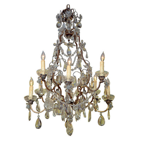 An elegant early 19th century gilt bronze frame adorned with original floral and shell motif crystals. Eight light. Rewired.