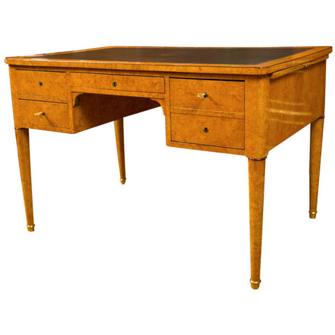 A Charles X burr ash and amaranth bureau plat having secure inner compartments and gold tooled black leather writing surface. Circa 1825. Acquired from Rupert Cavendish, London, 1992.