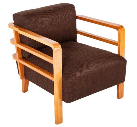Cherry Club Chair with upholstered back & seat with 3 banded square design. Circa 1935.