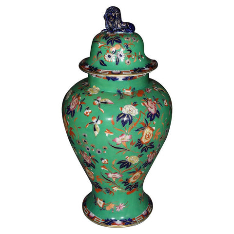 A mid 19th century English ironstone green ground vase with with cover topped by a lion finial with floral decoration and gilding.