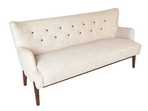 A sofa newly upholstered in Rogers and Goffigon fabric with contrasting leather buttons by Danish designers Eva & Nils Koppel. Produced in the 1950's by Slagelse Moblevaerk.