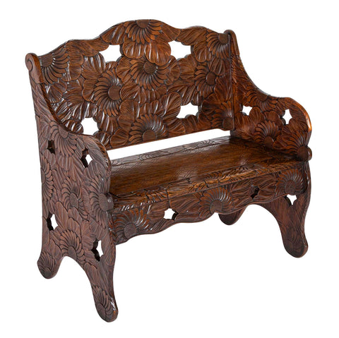 Detailed Flower Carved Beech Wood Bench for Liberty of London. Circa 1900. Japan.