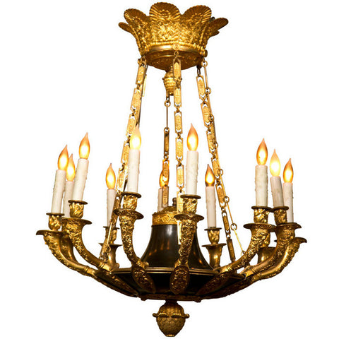 A magnificent early 19th Century twelve light Empire chandelier having exquisite d'ore bronze detailing.