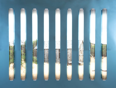 Blasted blue mirrored plexiglass on black acrylic, aluminum frame, archival pigment backlight prints with clear polycarbonate tubes having 2 foot LED bulbs.