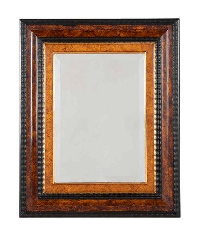Mid 20th Century Dutch Baroque style mirror with raised ebonized ripple molding framing faux bois painted sections and gilt wood interior molding. A very handsome and elegant mirror, though small in scale, it has outsize presence. The beveled glass really brings it all together. Hand crafted in Italy. Circa 1950's.