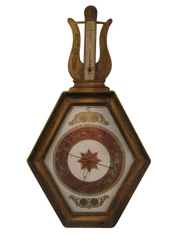 An unusual French Empire carved and gilt barometer with a lyre form top and beautiful reverse painted and gilt milk glass face. The works have been restored.