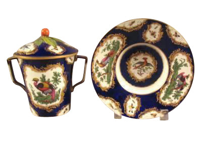 English Covered Cup and Stand polychome and gilt covered cup and stand with spurious 18th century Worcester marks.