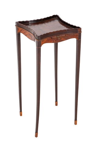 An English incurred George III (Hepplewhite) mahogany scalloped tray top on stand with satinwood cuffed legs and pull out slide.