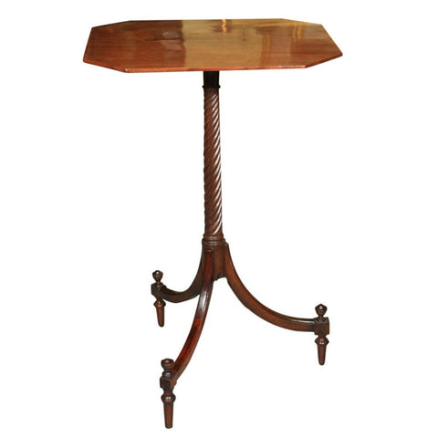 An English mahogany Regency style stand or small table with a carved rope-twist center column stem and tripod legs.