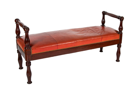 European mahogany window bench having turned arms and legs with carved acanthus corners and leather upholstered seat. Circa 1825.