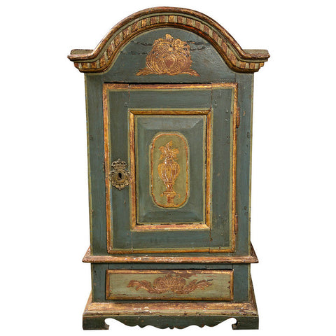 A Continental painted cabinet with an arched top, a door opening to a fitted interior and a lower drawer.