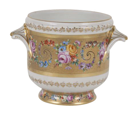 A French ceramic cachepot by Le Tallec, Limoges, with floral on gold design, a white base and two handles.