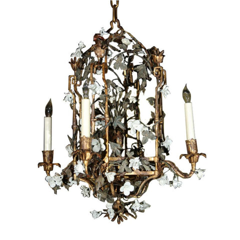 A French, Louis XV style gilt tole and porcelain mounted lantern decorated with gilt bows and porcelain flower heads. Late 18th century.