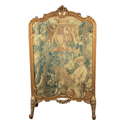 An antique carved and gilt Rococo style fire screen with an 18th Century French tapestry of a horseman in a forest surmounted by a coat of arms. Frame is late 19th Century. Good antique condition.