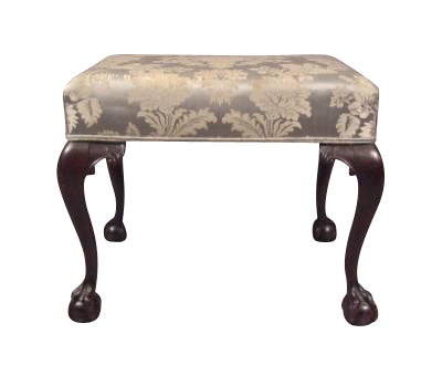 A George II, Chippendale style, ball and claw mahogany over-upholstered stool with carved "C" scroll knee blocks.