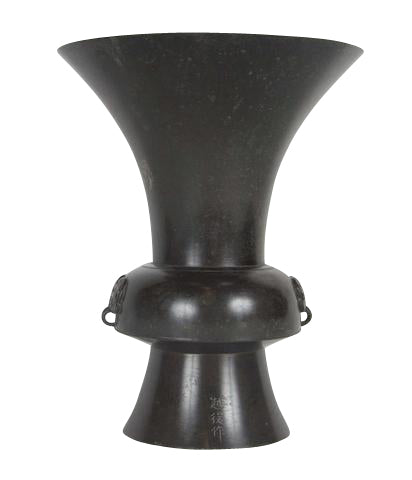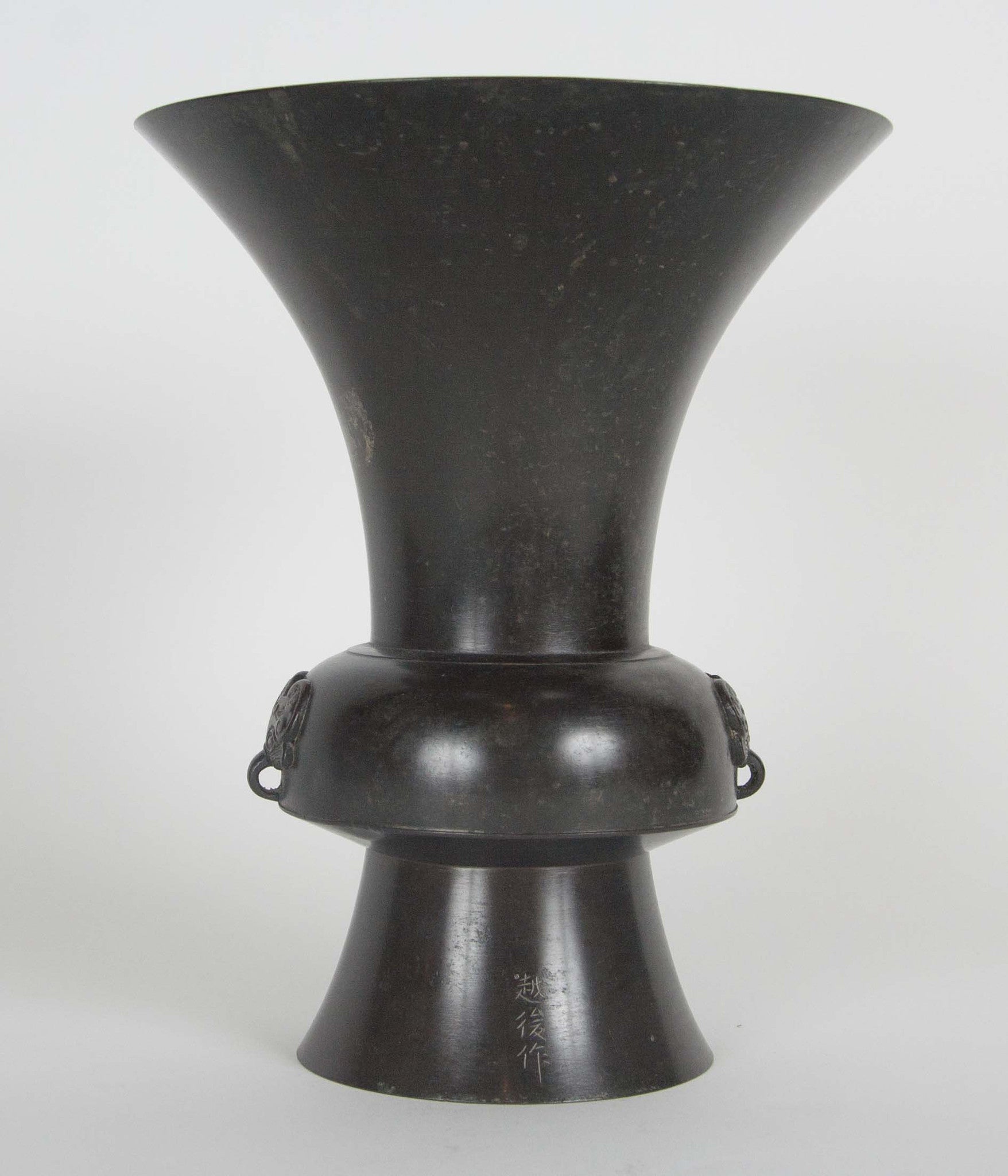 A Chinese Gu form bronze vase with a flared tip and stylized animal mask handles.