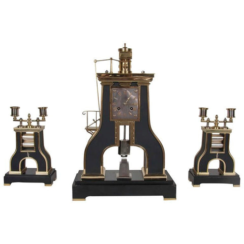 A handsome French clock set comprising a clock and a matching pair of candelabrum. The clock is a French industrial steam hammer type with brass movement. Signed GLT Paris and Japy Freres.