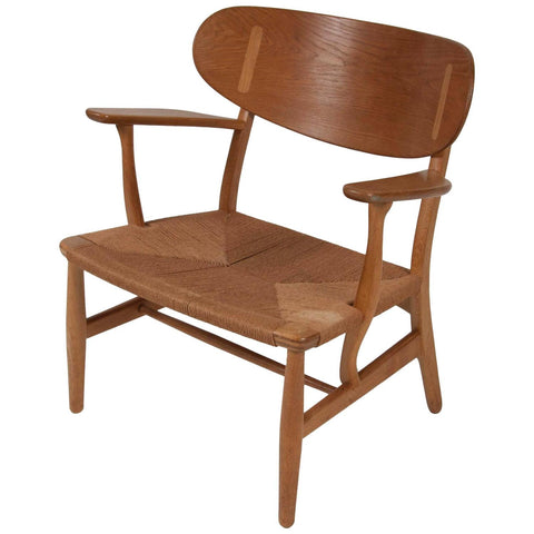 Oak armchair with wide paddle form arms and sculpted and inlaid back. Also having a Danish paper cord seat. The chair was designed by Hans J. Wegner and manufactured by Carl Hansen & Søn, 1951.Denmark.