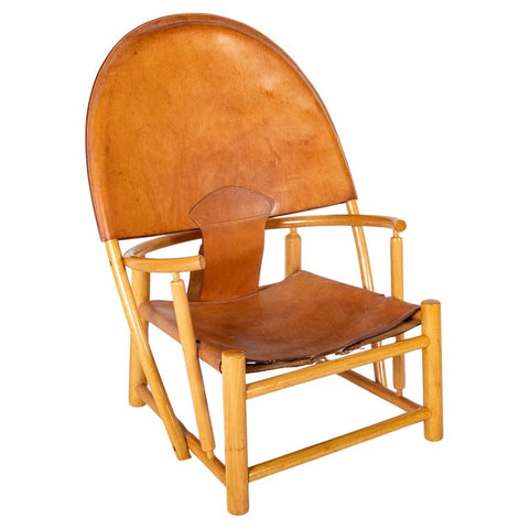 Oversized and huge on character and style this G23 Hoop chair design by Piero Palange and Werther Toffoloni for Germa is truly a masterpiece. An elegant curvacious solid maple frame combined with beautifully patinated leather seat. A beautiful specimen. The chair is solid and in excellent condition, it has lots of age appropriate patina on the leather and the wood that add to its beauty, see pictures for details.