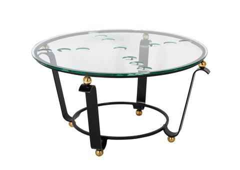 A Mid-Century round iron and brass ball ball dimple glass top table in the manner of Jean Royere. Mid 20th century.