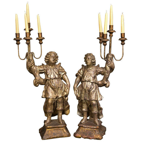 A pair of 18th century Italian carved figural, silver-gilt candelabra each with a four-candle arm.