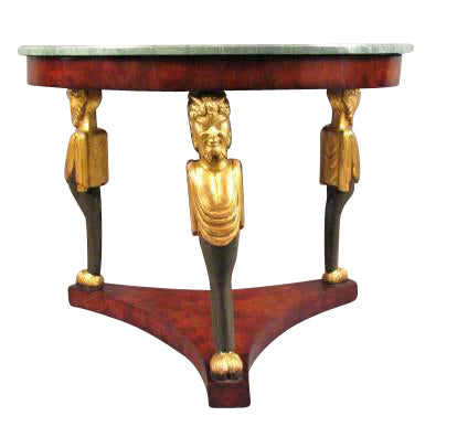 An Italian round mahogany center table with a green marble top and three legs with gilt carved herms.