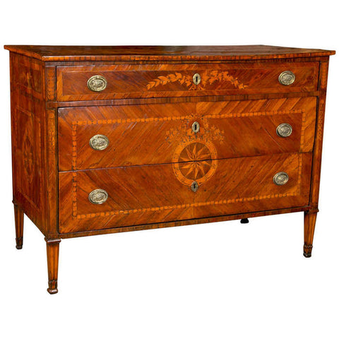 An 18th century Italian, Neoclassical commode from the area of Lombardy, possibly Milan. Decorated with pinwheel marquetry and floral inlay. Inlays of walnut, kingwood, rosewood and cherry over a pine poplar carcass. Circa 1790.