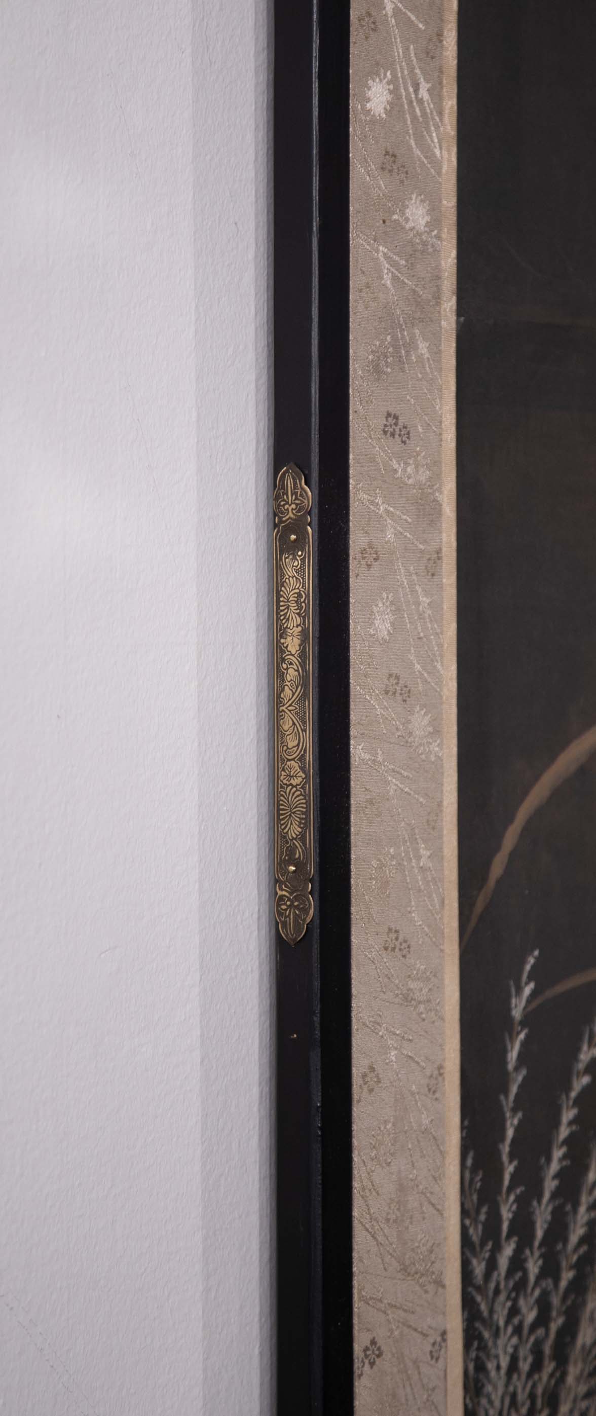 Japanese Showa Period silk panels painted with moon, morning glories and grass decor.  Circa 1926 - 1989.