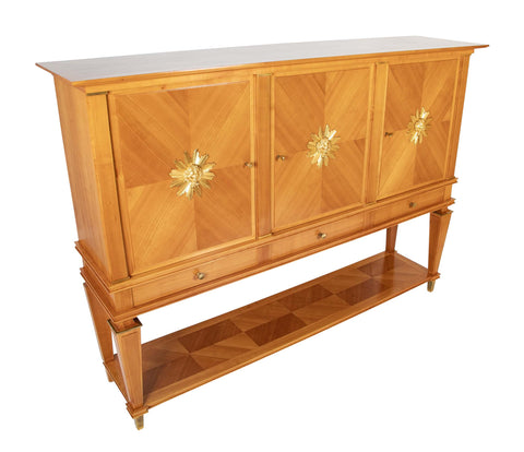 Jean Pascaud ( France.  1903 - 1996 ) blond mahogany credenza having 3 doors with radiating veneer from ormolu sun mask keyways by Russian sculptor Vadim Androusou       ( 1895 - 1975 ), and 3 drawers and spacer shelf.  Stamped.  Referenced in B. Foucart & J. L. Gaillemin "Les Decorateurs des Annees 40"  1998.