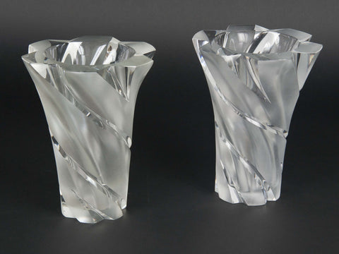 A pair of signed Lalique frosted crystal vases with swirl design,  "Narcisse".   May be sold separately at $2400 each.